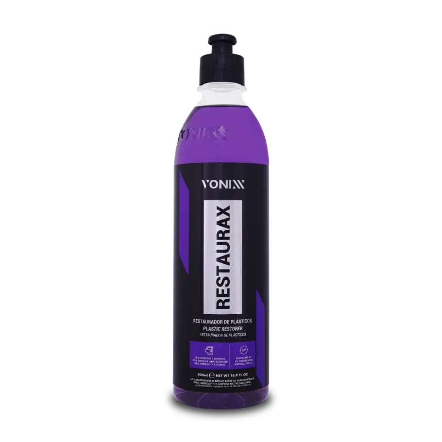 Restaurax renova e restaura superfícies plásticas, como para-choques, painéis e laterais de portas. Sua fórmula contém polímeros especiais que também protegem as peças contra as ações do tempo, evitando degradação precoce do material